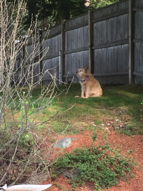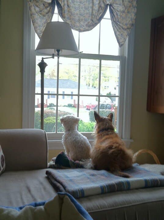Eventually, my daughter and her growing family moved next door to us and, in that setting, the relationship of Muffy and Bailey blossomed. Affectionately nicknamed ‘The Lion and the Lamb,’ the dogs had the run of the dual backyards, individually fenced but connected by a gate that, when open, allowed for easy movement to and from either house. Our days were filled with text messages asking, “Is Muffy over there?” or “Have you seen Bailey?” and with this system, we always accounted for an errant pup. Each morning saw a meeting punctuated by a nuzzle, or as we called it, a kiss, and a tandem trot to the grass to assume their positions in various states of recline. A singular unit, Bailey and Muffy always had a sense of the other’s location. They taught each other tricks like sneakily eating sticks (until scolded), feasting on the detritus from the bird feeders (until they got sick), and chasing squirrels (Muffy lacks any killer instinct).